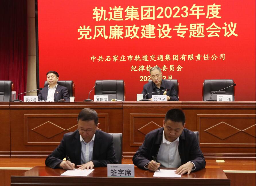 会议由狄政通通报了《中共石家庄市轨道交通集团有限责任公司纪律检查委员会2022年度执纪情况的报告》;付朝立宣读了《中共石家庄市轨道交通集团有限责任公司委员会关于落实全面从严治党主体责任和监督责任的分解方案》;轨道集团、设计单位、施工单位、监理单位的代表分别作廉洁自律表态发言;张世清与轨道集团班子成员代表签订了《党员(干部)党风廉政建设责任书》,狄政通与中层管理人员代表签订了《廉洁自律承诺书》,周伟和武卫民分别作了讲话。