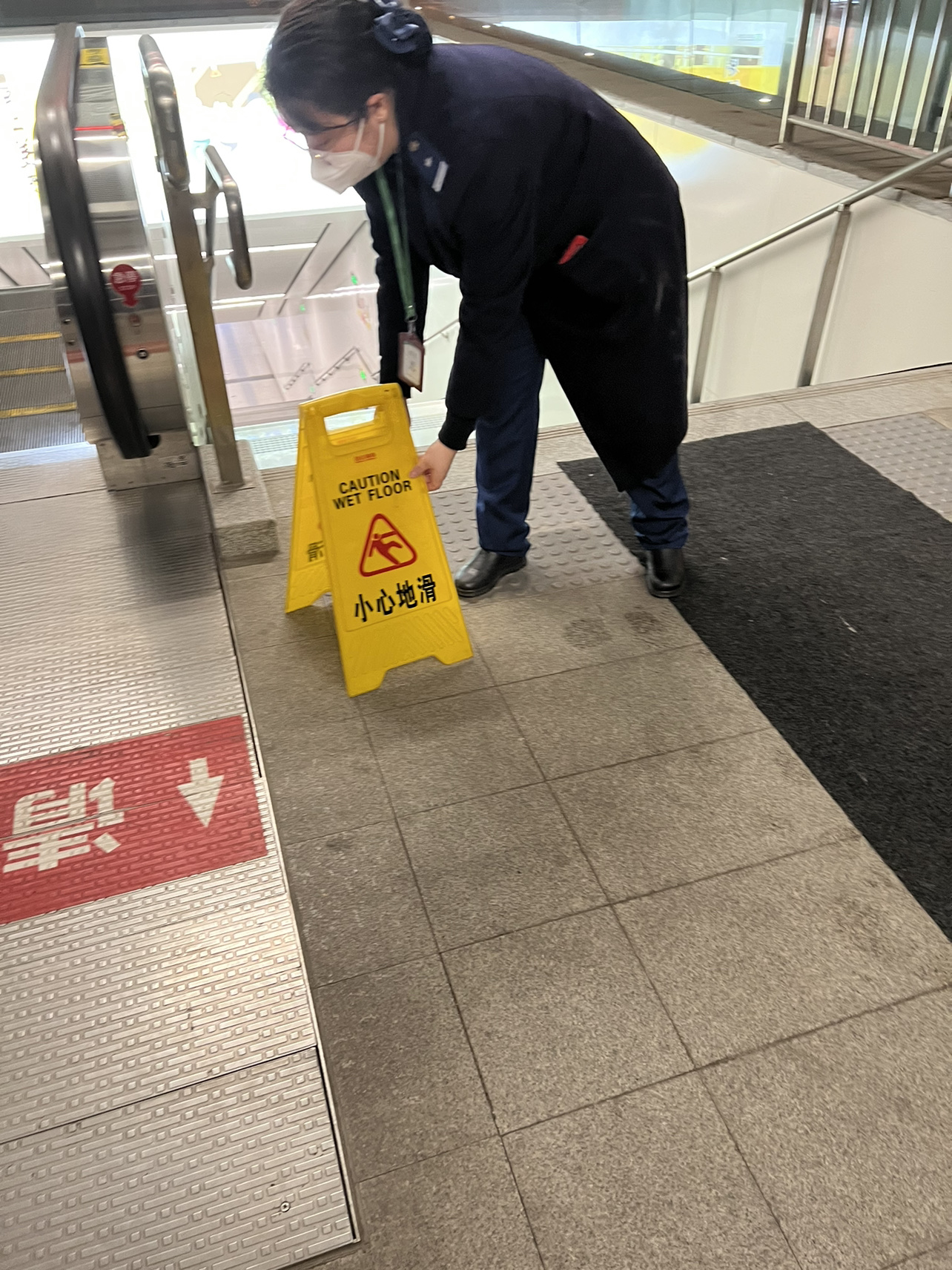 出现降雪天气后,石家庄地铁车站立即在公共区播放提醒广播,在地面湿滑区域的明显位置设置小心地滑牌,车站组织人员在出入口平台、楼扶梯下方铺设防滑垫,地面有积雪或结冰现象时,及时撒放工业盐并用铁锨、竹扫帚进行清理,车站人员及保洁加强巡视,及时打扫出入口积雪。