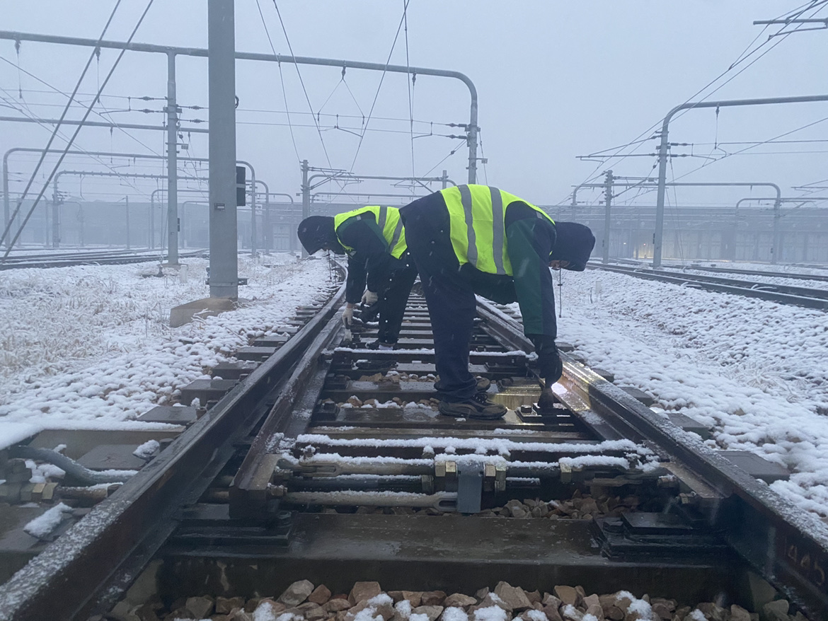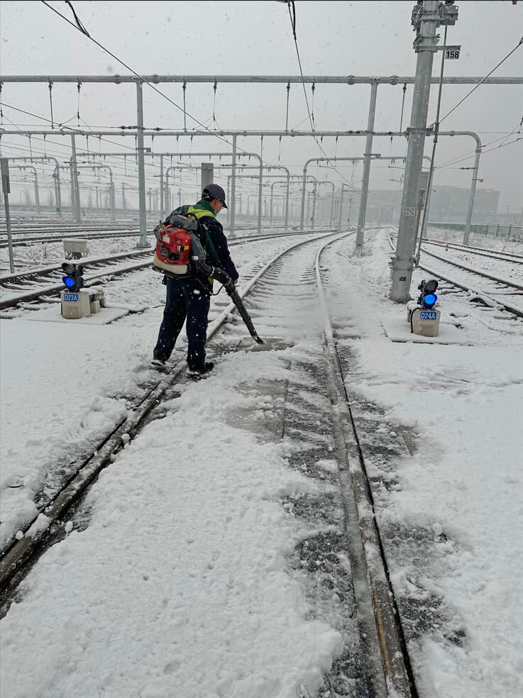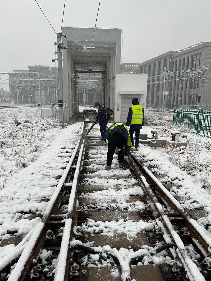 快速响应,迎战雨雪。接降雪预警后,除雪负责人迅速组织值班人员,准备工器具,对接车场调度、信号等专业明确除雪责任区域,降雪后第一时间安排人员赶赴车场信号楼进行驻站防护,积极与车场调度沟通了解收发车进路涉及的股道、道岔,除雪队伍携带相应工器具,对责任区域内的道岔、平过道等重点位置进行细致的除雪、除冰,清除完毕进行测试确认设备无异常后出清轨行区。