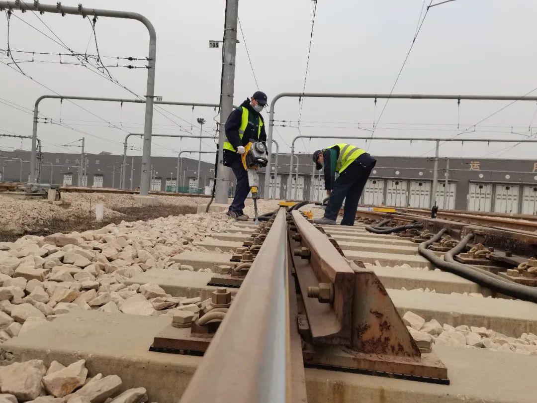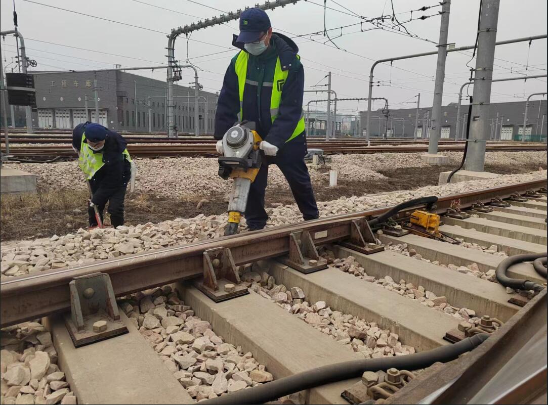 巡检锤敲击时的叮当声、捣固机作业时的嗡嗡声、生产组织起道作业时的指挥声……交响在石家庄地铁西兆通车辆段作业现场。轨道检修工们忙碌在各自的岗位,有条不紊地开展着维修作业。