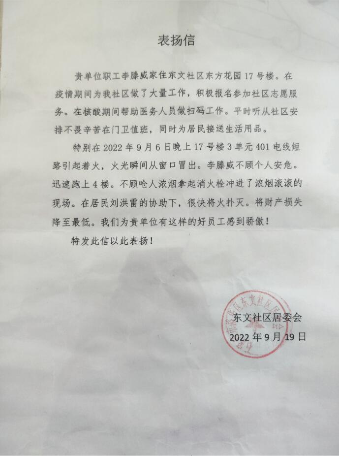 原来,在2022年9月6日20:00左右,运营分公司车辆部检修一车间员工李滕威在社区做志愿服务时看到同小区17号楼4楼有浓烟飘出,起初以为是居民做饭,但仔细观察后发现有玻璃掉落,感觉情况不妙,李滕威当机立断,不顾个人安危,迅速跑上4楼。就这么一会儿,现场已经浓烟滚滚,弥漫着呛人的味道。由于着火房屋是卧室,易燃物多,起势非常快,如不及时将火势控制,大火向临近房屋蔓延,将造成无法估量的严重后果。情况十分危急,李滕威不顾呛人浓烟拿起消火栓冲进了浓烟滚滚的现场,经过半个多小时的不懈努力,在大家的帮助下,终于将该火情扑灭,没有造成人员伤亡,也将居民的财产损失降到了最低。