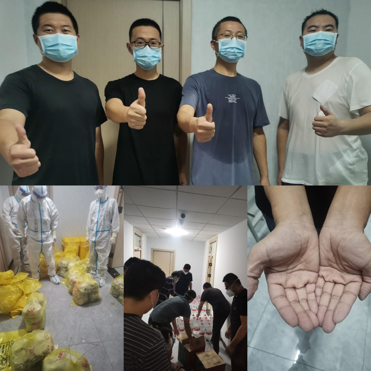 某天的晚餐送餐工作由许江涛,赵献斌,彭鹏承担。这是他们首次正式穿戴防护服投入实战,他们按照培训和演练学习到穿戴要求严谨地穿戴着防护服,为隔离人员送上晚餐。一个多小时后送完餐顺利归来,脸上被口罩勒出深痕,像是凿刻出的勋章,防护服里的双手被汗液泡的发白,泡出了深深地褶皱。他们却开心地分享着自己经历,为自己完成任务感到高兴,也对能为市政府防疫保障工作贡献自己一份力量感到了深深的荣誉感和责任感。
