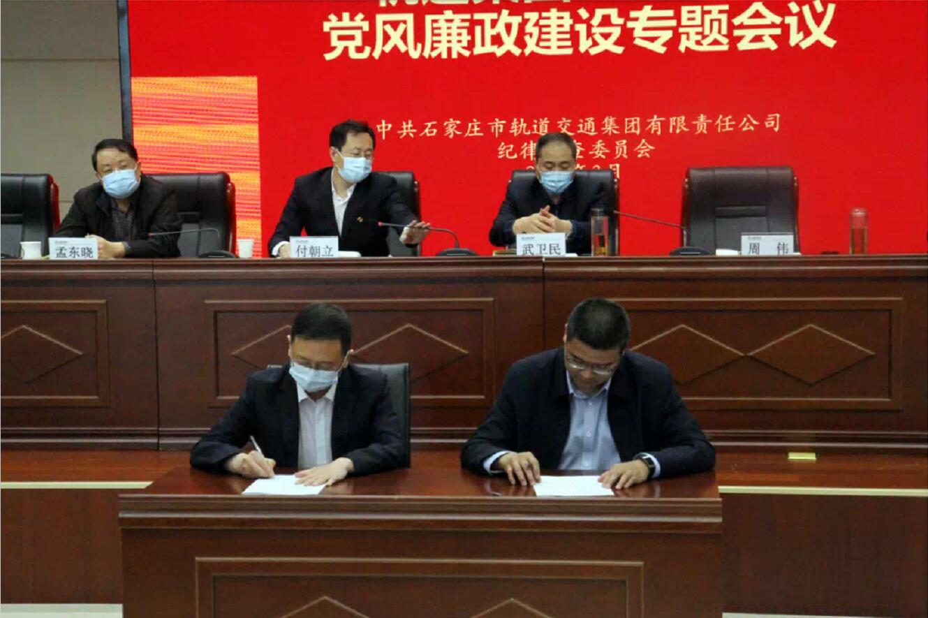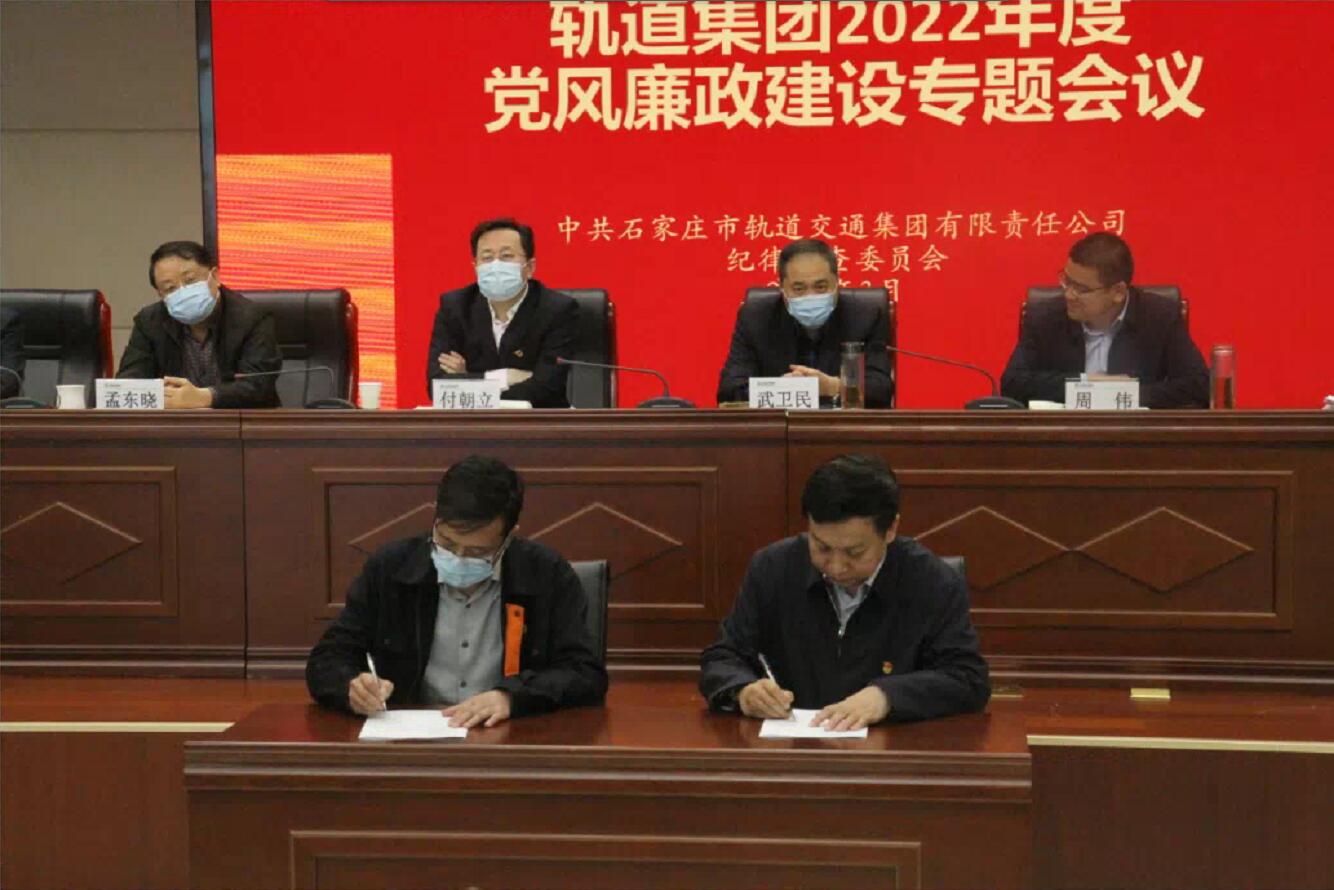 为认真落实党风廉政建设责任制,进一步提高干部廉洁自律意识,根据干部选任相关规定,3月31日下午,市轨道集团纪委在OCC行政办公大楼23楼会议室组织召开了轨道集团2022年度党风廉政建设专题会议。此次会议由轨道集团党委副书记、纪委书记、监事会主席狄政通主持,交投集团党委委员、纪委书记、监察专员、监事会主席武卫民,交投集团副总经理、轨道集团董事长周伟,轨道集团党委副书记、副董事长、总经理付朝立以及其他班子成员、中层正职和新提拔的中层干部参加了会议。会议举行了责任状签字仪式,周伟与轨道集团班子成员代表谢志峰签订了《党员(干部)党风廉政建设责任书》,狄政通与新提拔干部代表李晓飞签订了《廉洁自律承诺书》,付朝立、周伟、武卫民分别作出重要讲话。