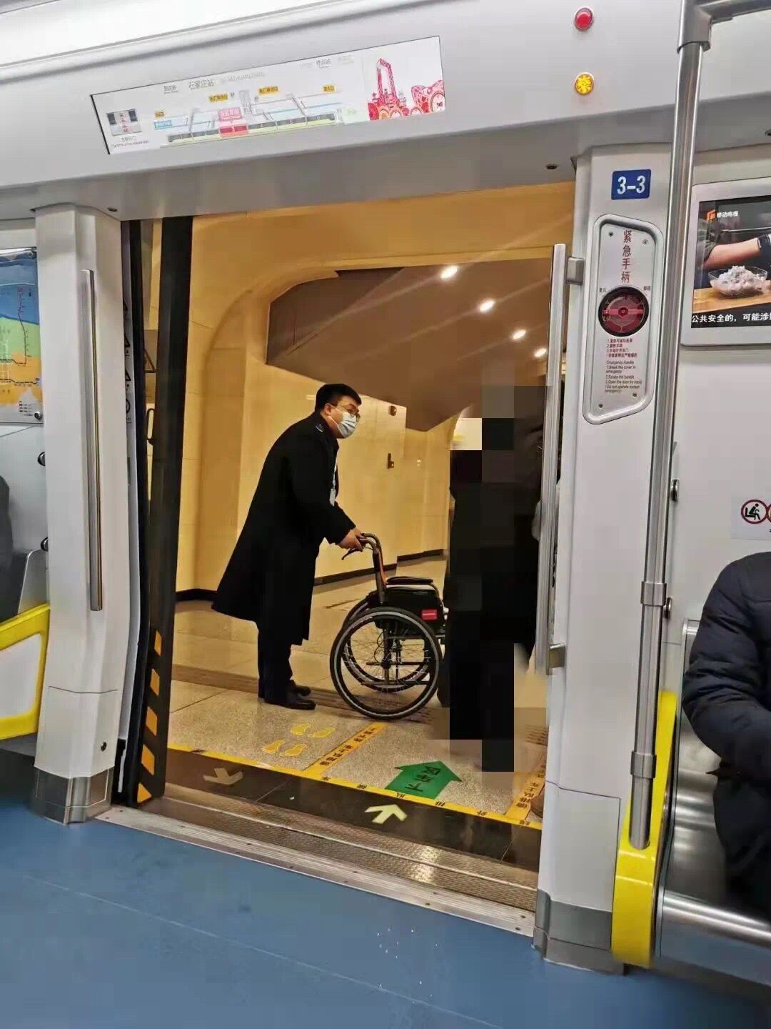 1分钟后,19档车厢门一打开,石家庄站站台岗吕钉烜已准备好轮椅静静等候。列车停稳后,吕钉烜上车搀扶乘客安全下车,并用轮椅稳稳地将乘客送至3号线站台。等列车到站,吕钉烜将乘客送上列车后,石家庄站将接力棒传到了下一站接应人员手中,真情一路在3个站点中传送!