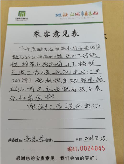 8月23日,谈固站值班站长巡视车站时,发现一名老人一手领着小孙子一手提着小推车在进站口踟蹰,望着长长的楼梯面露难色。经常帮助乘客进站的值班站长心想,老大爷肯定是没办法一起带着孩子和小车走楼梯。这样想着,她已经向老大爷走了过去。“大爷,我帮您拿东西,您拉好孩子,咱们一起下去。”值班站长一边搬起小推车,一边还注意着老人和孩子,不时提醒他们小心脚下。顺利进站的老人终于露出了笑容,对工作人员的帮助十分感激,执意留下一封表扬信。