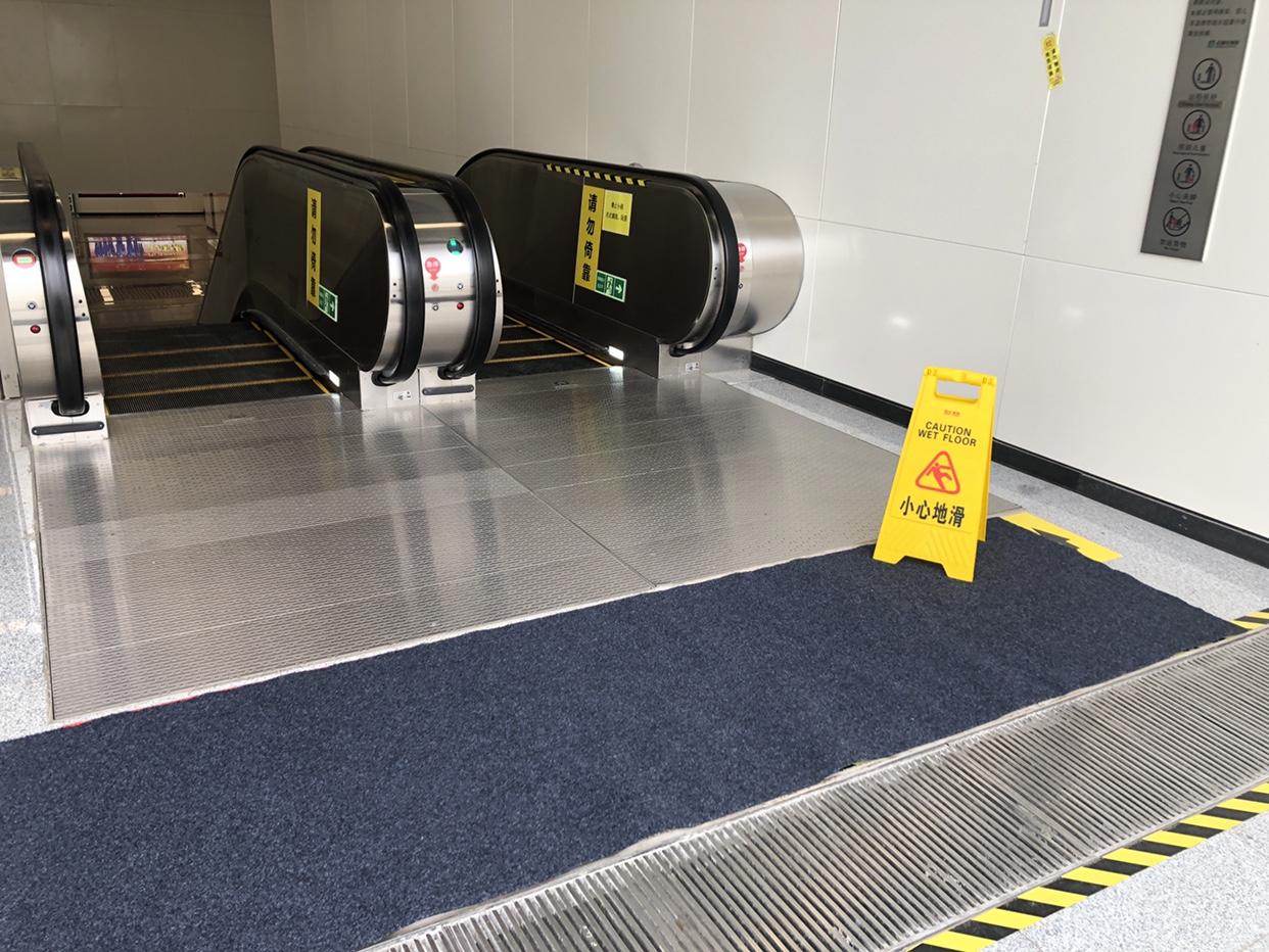 下雨地面湿滑,石家庄地铁各车站会铺设防滑垫,摆放小心地滑牌,在进出站乘坐扶梯时要抓紧扶好,小心脚下。