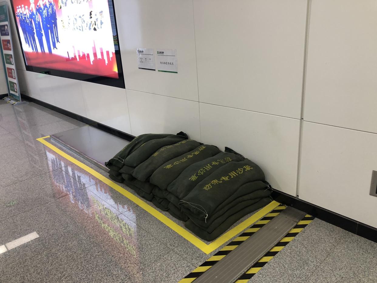 如降雨较大,出入口出现雨水倒灌,每个出入口都摆放了防汛沙袋和防淹挡板。工作人员会第一时间将沙袋摆放在出入口,防止雨水倒灌车站。
