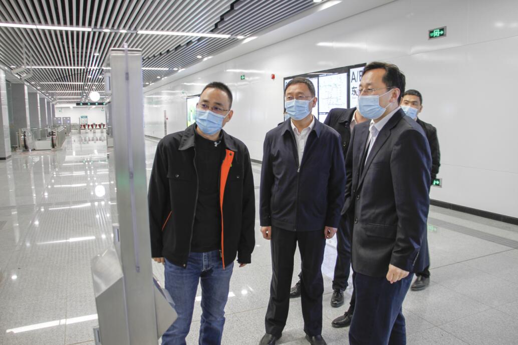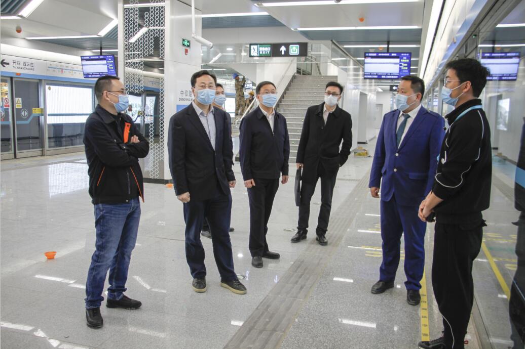 石家庄地铁3号线一期东段及二期工程通车在即,为保障开通初期运营,给广大乘客提供安全、舒适、温馨的乘车体验,2021年4月2日上午,市轨道集团副总经理付朝立,运营分公司经理谢志锋、总工程师桑静波一行到车站进行督导检查。
