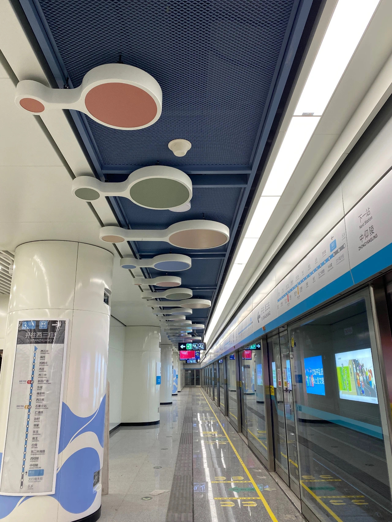 南王站:站点周边环境优美,有文化娱乐的霞光大剧院,有充满活力的体育公园。南王站将公共元素融入地铁站公共空间,天花造型通过运动元素照明灯达到丰富空间的效果。天花两侧运用大自然的黄绿色加以运动元素三角形为中心进行大面积横向设计,造型典雅优美,清新自然,寓意人与自然浑然天成。
