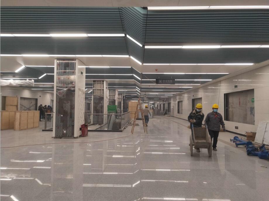 3号线二期天山大街站现场,正在装修的车站显得一派忙碌。3号线二期的中仰陵站和天山大街站的装修工程由中铁二十五局集团承建施工。该标段项目部经理冯继伟介绍,复工后,建设者们尽全力降低着疫情影响,加快着建设步伐。当前,天山大街站总的装修进度已完成约90%,目前主要在进行装修收边收口、出入口通道和站前小广场的施工以及配合联调。天山大街站是装修标准站,依旧延续了3号线白色基调,蓝色点缀的风格特征,以简洁、明快、标准化为主导,整体感观良好。