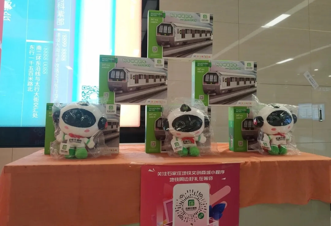 石家庄地铁文创产品与大家见面啦!现场设有1号线列车拼装积木、石乐乐毛绒玩偶等文创产品展示,顾客可以近距离接触文创产品,了解石家庄地铁文化。
