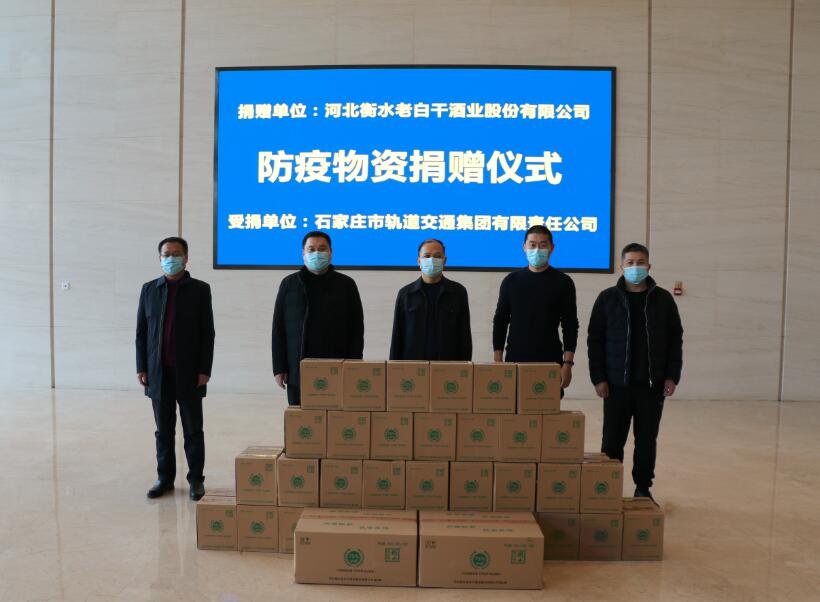 1月26日下午15点,河北衡水老白干酒业股份有限公司向石家庄市轨道集团捐赠消毒物资50件,共300余瓶。衡水老白干营销有限公司副总经理贺延昭一行参与捐赠活动,轨道集团安监部部长王存礼、运营分公司副经理王龙代表轨道集团接受捐赠。