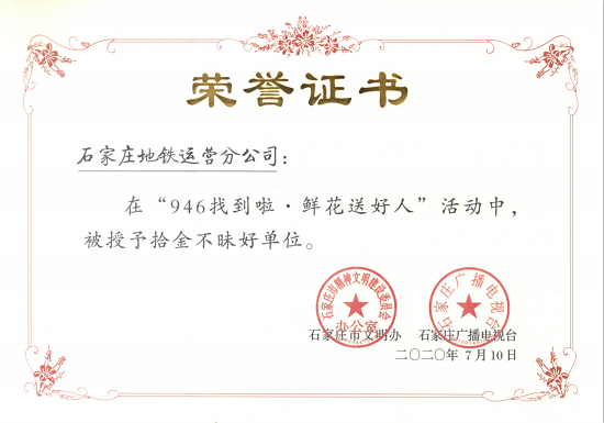 近日,石家庄地铁运营分公司收到一本证书,被授予“拾金不昧好单位”!