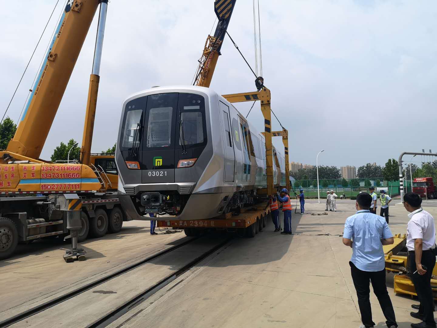 6月29日上午,3号线二期工程首列电客车在西兆通车辆段正式亮相,经过吊车、落轨、编组等一系列工作后,由工程车牵引入库停车。