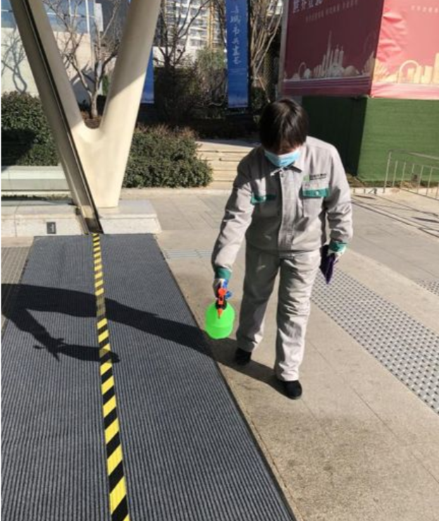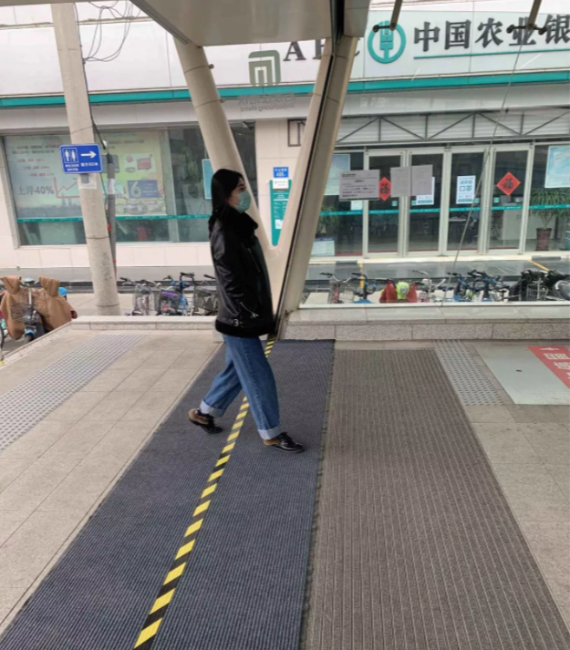 消毒地垫放置在地铁车站出入口和设备区通道口,便于乘客和工作人员在进入地铁时对鞋底消毒。消毒地垫划分为两个区域,一侧是消毒区,另一侧是干燥区,乘客及工作人员通过踩踏地垫“消毒区”对鞋底消毒,通过踩踏地垫“干燥区”来擦干鞋底,防止鞋底湿滑发生危险。工作人员对出入口消毒地垫至少每3小时清洁消毒1次,对设备区通道口消毒地垫至少每6小时清洁消毒1次,保证消毒地垫的消毒效果。