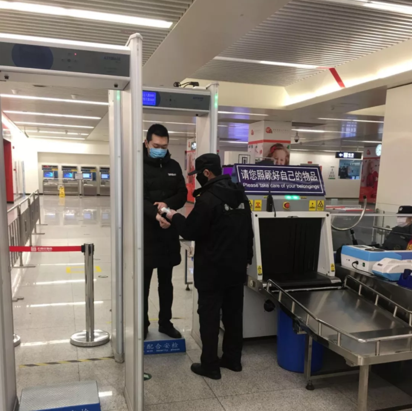进站安检严格按照规定测量体温,逢进必检、逢人必测,要求乘客全程佩戴口罩,发现未带口罩人员立即进行劝阻。发现乘客体温异常,第一时间将乘客带至车站设立的乘客留置室进行隔离,对乘客行经的路线进行消毒,同时拨打120将乘客送医,并按规定上报信息。乘客离开后对留置室进行全面消毒。