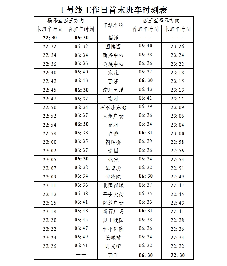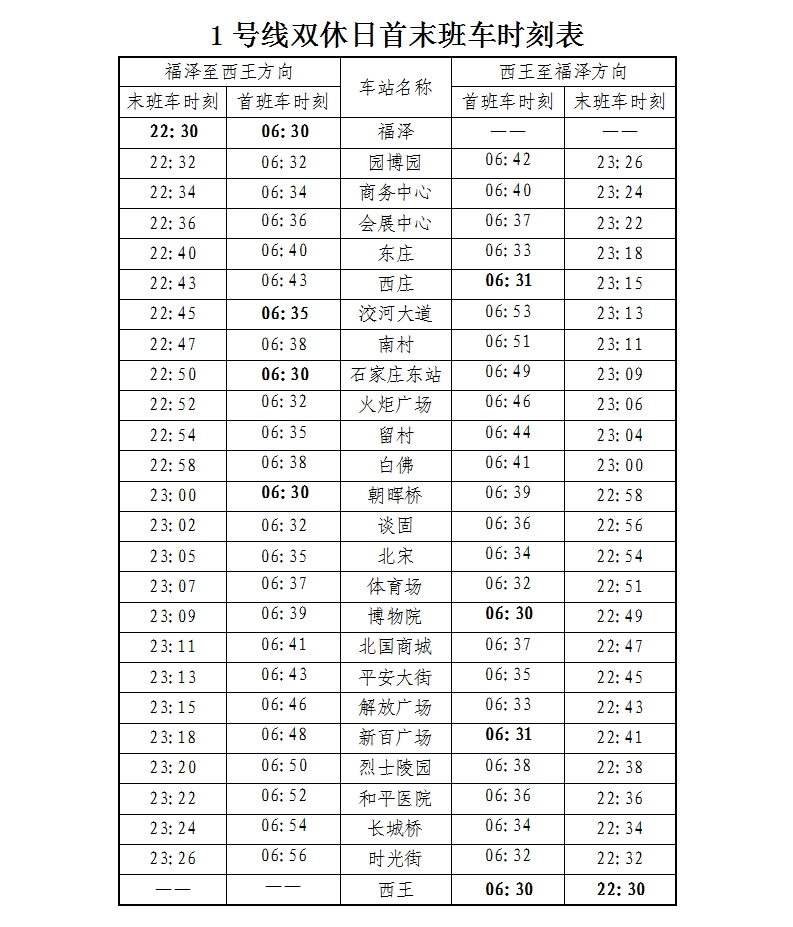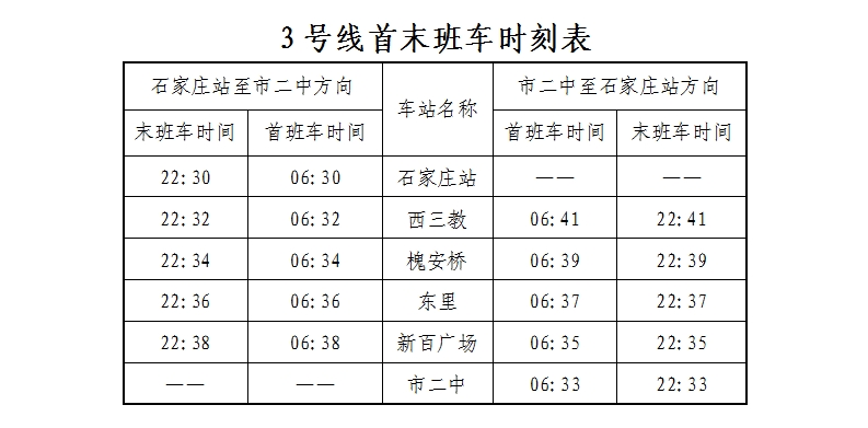 为满足春运期间乘客出行需求,2020年1月10日至2020年2月18日,石家庄地铁1、3号线将延长运营时间至22:30,各站首末班车时刻如下: