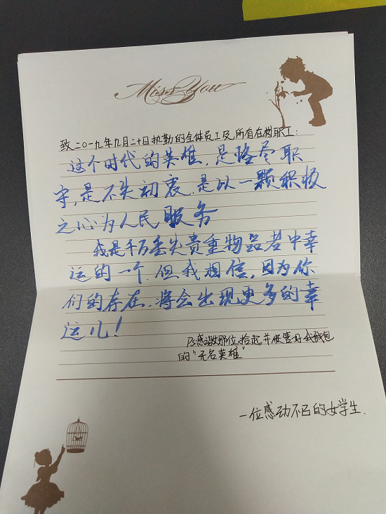 2019年9月20日上午,地铁谈固站站台工作人员捡到一个蓝色的钱包,考虑到乘客丢失钱包焦虑的心情,车站工作人员通过多种途径积极寻找失主,在大家齐心协力的寻找下,很快与失主取得了联系。下午,丢失钱包的女同学前来车站认领,工作人员核实身份后将钱包完好归还,女同学拿到失而复得的钱包,十分激动,连连向工作人员道谢。一周后,女同学专程来到车站,送上自己亲手绘制的“无名英雄”画像及感谢信一封,表达她对地铁工作人员恪尽职守、为民服务精神的赞扬之情。