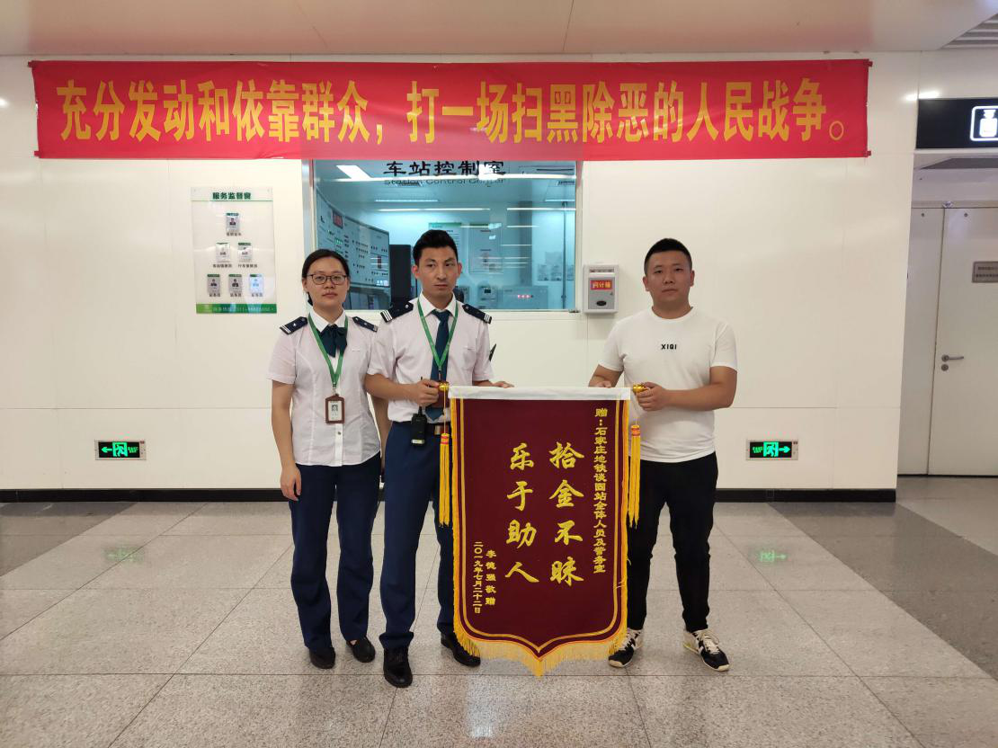 2019年7月23日下午,乘客李先生给地铁谈固站送来一面锦旗,对车站工作人员的热心服务表示感谢。