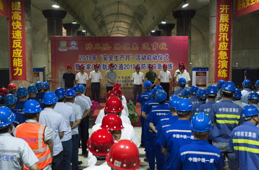 5月31日上午,市轨道公司联合中国中铁石家庄地铁2号线工程建设指挥部,在2号线一期工程大戏院站开展了2019年“安全生产月”活动启动仪式暨石家庄市轨道交通2019年防汛应急演练。市轨道办总工程师杨立众、市应急管理局救援协调和预案管理处处长赵立生、市建设工程安监站市政科科长谢亚力、中国中铁石家庄地铁2号线指挥部指挥长刘泽民等出席启动仪式。