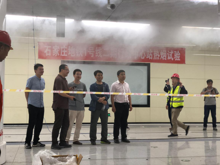 2019年5月17日,石家庄地铁1号线二期热烟测试在行政中心站举行。热烟测试是1号线二期试运营前一项重要的安全测试,目的是检测地铁车站火灾探测报警系统、通风排烟系统、站台门系统、事故照明、事故广播、疏散指示、闸机、扶梯的工作效果、可靠性及联动状况。