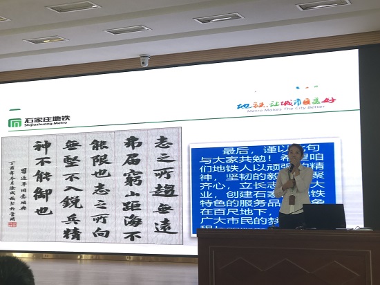 最后,王龙副经理对此次培训进行总结、对服务质量评价工作进行要求、对分公司全员提出希望。他对分公司企业管理部认真对标、圆满完成培训表示肯定;对各部门履行岗位职责,提供优质服务表示认可;针对服务质量评价工作,他要求各部门需高度重视、提高站位,积极落实规范要求,以更高的标准来迎接服务质量首次评价。“志之所趋,无远弗届;穷山距海,不能限也。志之所向,无坚不入;锐兵精甲,不能御也”,他希望地铁人以顽强的毅力,坚韧的品格,聚齐心,立长志,创大业,创建石家庄地铁特色的服务品牌形象,在百尺地下,连接起广大市民的梦想和归程!