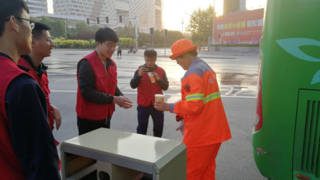 朝阳升起时,志愿者们热情的把一杯杯温暖的豆浆送到工作中的环卫工人手中,道声“您辛苦了”。一句暖心的话语,一杯带着关爱的豆浆,传递着温暖、尊敬与感谢,对于早早就走出家门清扫卫生的环卫工人来说,这杯热豆浆,温暖的不仅仅是身体,更温暖了他们的心。石家庄地铁青年志愿者们与“城市的美容师”热情交流,更深入的了解到他们每天都是披星戴月,不畏严寒酷暑清扫着马路,为了城市的洁净而付出了太多的艰辛与不易。