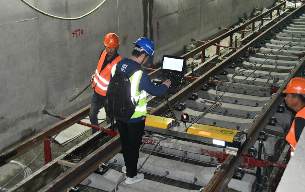 4月18日上午,记者在嘉华站现场看到,一排排的钢轨由大型机械吊装入隧道,施工人员正在进行连接、铺设作业,现场一派忙碌。在隧道深处,一名身穿绿色马甲的工作人员正站在轨道上测量。“每条钢轨都要进行测量,通过对轨道检测数据,分析轨道的平顺性,再对钢轨的质量进行评估。”工作人员告诉记者,这台机器叫轨道几何状态测量仪,可以全方位对钢轨方向、水平、轨、高低等都进行监测,属于高精度测量,可指导长轨精调。