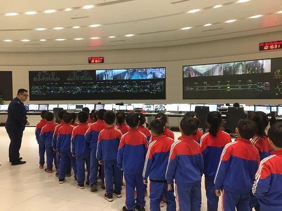 活动第一站,参观队伍来到了有着地铁“中枢神经”和“最强大脑”美誉的OCC控制大厅。它负责对全线网列车运行、客运组织、车站运作、电力供应 、防灾报警、信息收发等地铁运营全程进行监控和指挥。当小朋友们看到科技感十足的LED大屏时不禁发出了惊叹声,个个兴奋不已。地铁工作人员详细为大家讲解了控制大厅内各项设备的组成、岗位人员构成等内容,让大家直观地通过LED屏了解到已开通的两条地铁线路的运行情况。