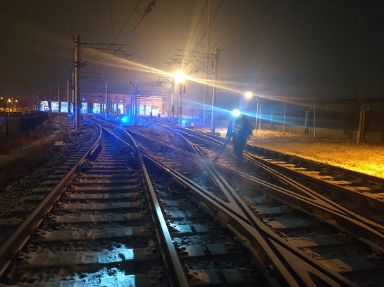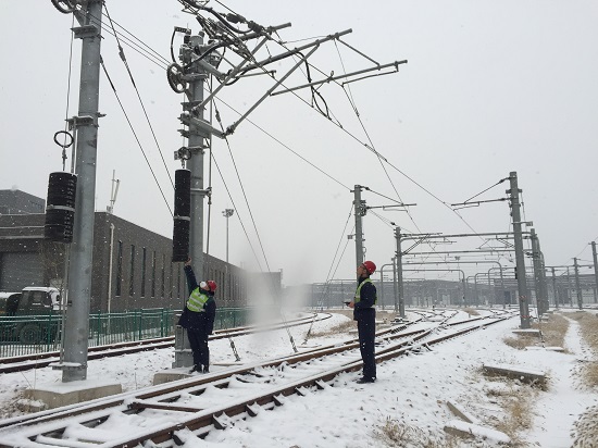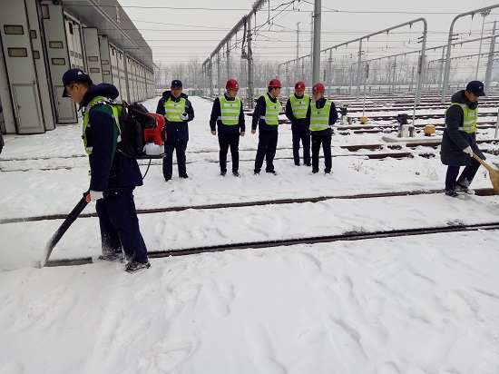 石家庄地铁人以雪为令,自2月13日降雪以来,轨道、信号、接触网等室外设备专业就开始雪中巡视。伴随着降雪加大,综合维修部除雪队响应及时,迅速出动,利用背负式吹雪机、除冰铲以及除雪扫把对道岔转辙机、各部轮缘槽以及平过道等容易积雪的部位进行全方位除雪。