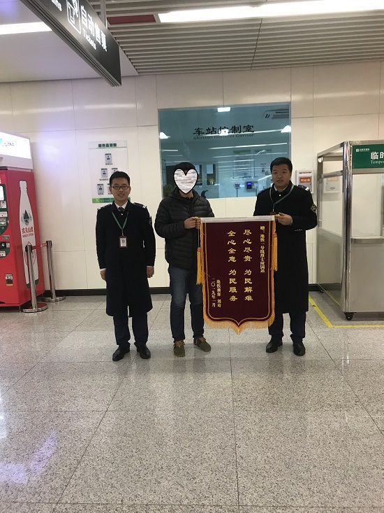 2019年1月24日,乘客刘先生亲自来到烈士陵园地铁站,送上一面印有“尽心尽责,为民解难;全心全意,为民服务”的锦旗,以此感谢在危急时刻车站工作人员的及时救助。