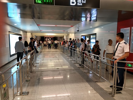 开幕式当天,学勤副市长、庆文董事长、张龙副主任、朝立副总经理及分公司相关领导来到体育场站指挥工作。车站员工早早的在体育场做好应战准备,轨道交通公安、地铁保安、安检增加人员配备,全面做好现场治安保障工作。同时,车站抽调各站客运服务人员,在各区域设置区域负责人;在出入口、站厅设置铁马分隔客流,增加免费通道数量;在关键位置安排专人引导,加快乘客进出站速度;在站厅增加临时票亭,做好乘客兑零和预制票售卖工作;在站台增加支援人员,屏蔽门即将关闭时做好拦截,避免由于乘客过多、抢上抢下,造成夹人夹物。各区域明确分工、互相配合、紧密联系,全面疏导大客流。按照市委、市政府下发的《河北省第十五届运动会开幕仪式保障工作方案》文件要求,此次开幕式的运动员、演职人员及观众可以凭相关证件免费乘坐地铁,9月8日开幕式当天,石家庄地铁为8202名乘客提供免费进出站服务。