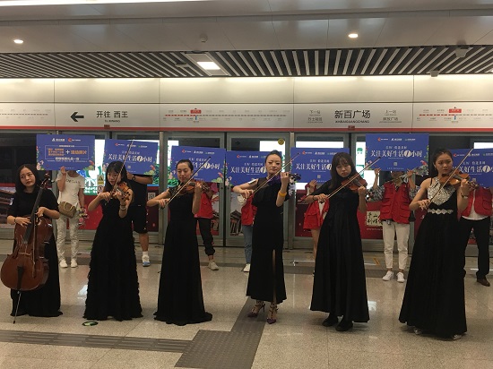 9月5日上午,在地铁站内行色匆匆的上班人群中间,突然出现6名身着晚礼服的美女演奏家和1名小丑魔术师,穿梭在地铁站及车厢内表演。悠扬的乐曲声回荡在地铁大厅,小丑滑稽的表演和近景魔术吸引了众多市民驻足观看。表演结束后,演奏者和小丑魔术师分别举起和变出印有“美好·恰逢其时”关注美好生活一小时字样的条幅,并向围观市民送上了美丽的鲜花。