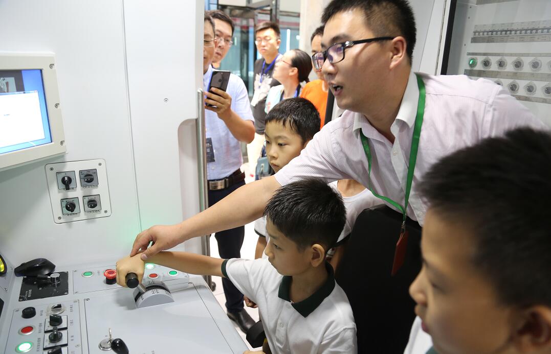 随后小学生们来到了驾驶员室,一睹地铁驾驶室的风采。由专业的讲解工程师为小学生进行讲解地铁司机每天的工作。小学生不仅认真聆听现场工作人员的介绍,还小心触摸了每一个操作按键,细看显示屏上每一个显示提醒,嘴里还直呼“开车”真过瘾。