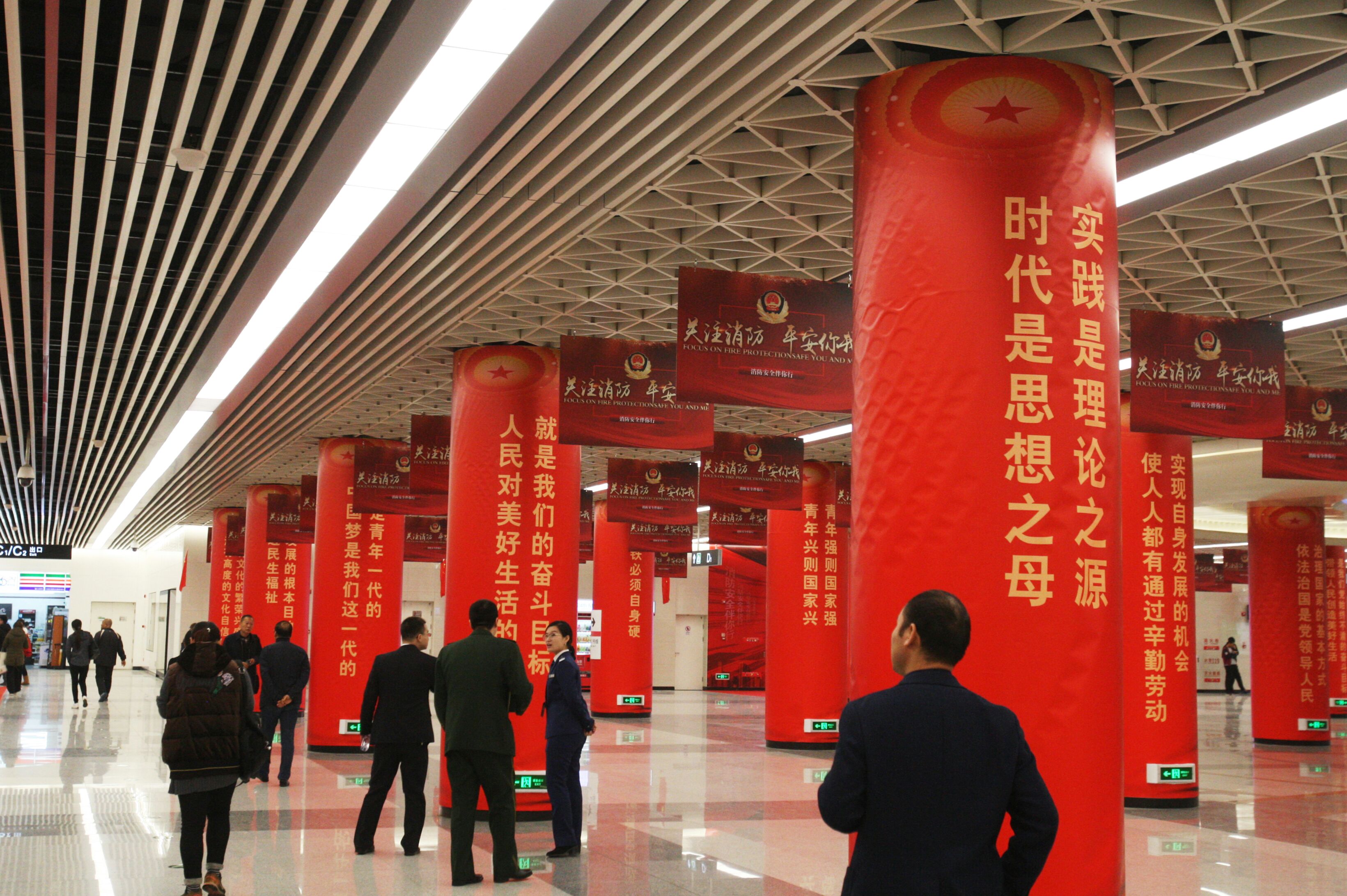 在石家庄地铁1号线北国商城站,记者看到站厅层的公共空间已被装饰一新。出入口门头位置“学习贯彻党的十九大精神,开启全面建设社会主义现代化国家新征程”标语醒目可见,出入口通道内十九大宣传标语也是精心布置。公共区域的圆柱上张贴着关于十九大精神的热词金句盛装亮相。公共区域正中的一棵祝福许愿树最为引人注目,树上挂满写有对祖国祝福和期盼的心愿卡,读来温情暖心。