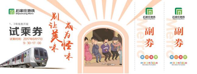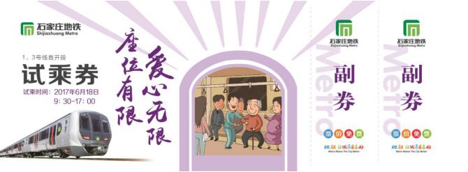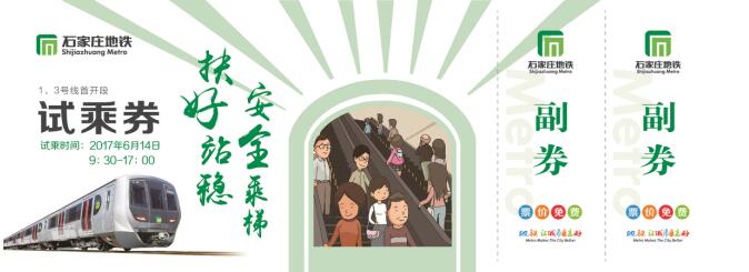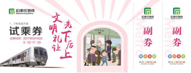 在石家庄创建全国文明城市的关键时刻,石家庄地铁围绕“文明乘车”的主题,推出五款试乘券,宣传各类文明行为规范,将地铁车站打造成提升乘客文明素质的重要宣传场所。五款试乘券每款3万张,共计15万张,每款试乘券指定日期,仅限当天使用。
