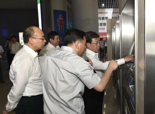 赵克志、许勤等省领导在石家庄站地铁站,察看地铁自动售票情况。