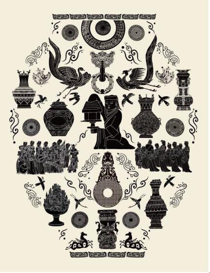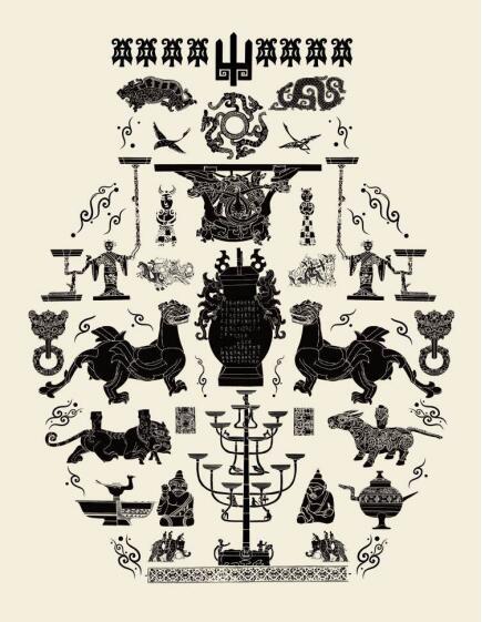 战国时期的中山国,是仅次于战国七雄的诸侯国,以高超的文化艺术水准睥睨群雄。作品选取中山国出土的错金银四龙四凤方案、错金银虎噬鹿屏风底座、银首人俑铜灯、错银双翼神兽等代表性文物,巧妙的组成中山国青铜器造型,体现了纵横驰骋的中山雄风和昂扬不羁的战国精神。