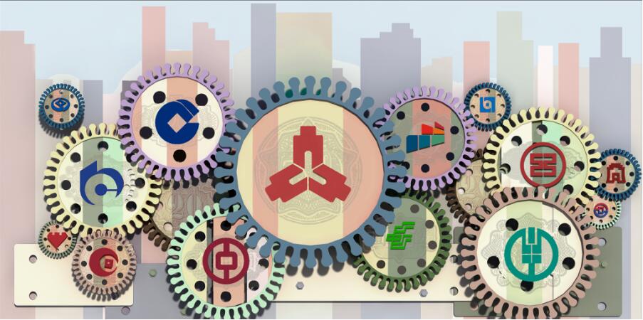 中国人民银行是我国银行业的最高管理机构,本画面的齿轮代表各大国有银行和省内著名的地方银行,簇拥在人民银行周围。齿轮间互相咬合,不停运转,形成一部强大的动力中枢,为经济发展输出源源不断的动力。齿轮中银行行徽的底纹,采用在小灰楼发行的第一套人民币水纹;上方背景选用升腾的现代城市轮廓线,寓意着在中国人民银行的主导和各大银行的配合支持下,全国全省朝着伟大复兴的中国梦前进;各个银行标徽又象朵朵花开,寓意着社会经济发展欣欣向荣。
