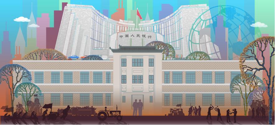 整体画面以中国人民银行旧址小灰楼和如今的人行新楼为主角,写实手法的小灰楼占据画面前部中间位置,着重体现本站的小灰楼作为人民银行发祥地的基本信息;画面底部是朝阳映衬出来的地平线剪影,表达建国初期激情饱满的生产建设场景;上部是当今中国人民银行总部,全面体现中国人民银行成立至今的光辉历程。背景意象为: 现代城市天际线、现代人民幸福生活缩影以及寰球意向,体现中国人民银行在当今世界经济体系的重要作用。