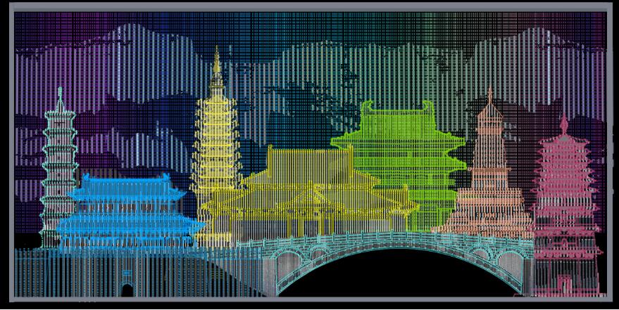 整体画面以石家庄的著名古文化景观尤其是正定老城古建筑为题材,突出宣传石家庄的旅游文化资源,给火车站外来客人留下直观的第一印象。画面主要形象由赵州桥、正定南城门、正定四塔(澄灵塔、华塔、须弥塔、凌霄塔)、隆兴寺主要建筑组成,以嶂石岩回音壁作为背景;赵州桥横跨画面表现文化通达、历史跨越的含义。作品运用现代高科技水晶内镶嵌纤维灯技术,立体感强,色彩丰富,明暗变幻,通透灵秀。