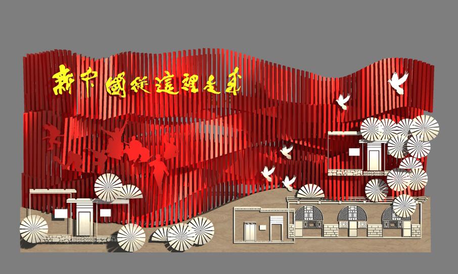 新中国从这里走来!西柏坡是全国公认的红色革命圣地。整幅画面突出西柏坡是中国革命事业走向胜利的“一面旗帜”这一鲜明主题。松柏、白鸽、西柏坡旧居等各种元素点缀其中。整面红旗采用竖向红色线条组合,打破了平面的呆板感,鲜活灵动,韵律感强,同时象征中国革命事业蒸蒸日上、充满生机;松树、白鸽象征中国人民爱好和平、革命江山永驻;解放战争场景人物象征着中国共产党人艰苦卓绝的革命精神。“新中国从这里走来”八个字是黄镇将军题写的。