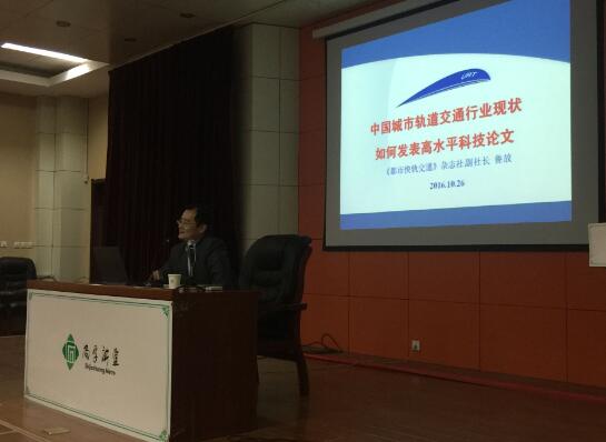 2016年10月26日在尚学讲堂举办了发表高水平科技论文的培训。《都市快轨交通》杂志社副社长鲁放担任培训主讲,主要讲授了科技论文的概念和分类、科技论文的文体与格式、如何撰写科技论文、科技论文的投稿与发表、论文发表后续工作等内容。授课完毕后,鲁社长耐心解答了大家在论文撰写、发表方面的疑问。