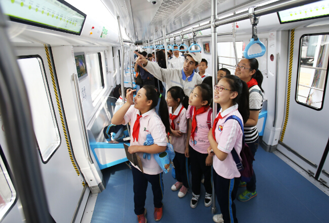跟着工作人员,孩子们进入了地铁列车内部。他们大多是第一次见到地铁列车,好奇地左瞧瞧,右看看,这摸摸,那坐坐。“这像是大公交车和火车的合体。”李泽雄同学坐到座椅上,使劲弹了一下,“我可得好好坐坐,这可是我第一次坐上地铁列车,真酷!等石家庄地铁开通了,我再坐一次,估计开起来的感觉更爽。”而周玉晗同学则聚精会神地听着工作人员的讲解,并不停地在自己的笔记本上记录着:“这是A型车,是国家地铁标准车型中载客量最大的车型,载客量为1860人,满载客量可达到2520人……”“以前过六一,我都是和几个同学一起到公园玩,为了省钱,去年我们几个人步行到长安公园玩。我觉得今天的这个六一最有意义,我第一次看到了地铁列车,还学到了很多地铁知识。”周玉晗大眼睛一眨一眨的,掩饰不住自己内心的激动。