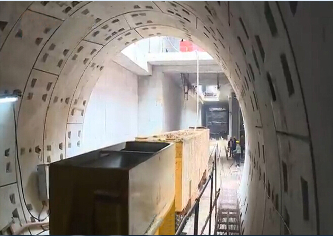 上午10时,沿扶梯来到地下18米深处,一台长长的盾构机映入眼帘,机身上附着红色的旗帜,它位于左线区间隧道,工人师傅正在盾构机的前端进行最后的机器检查。而与之相邻的右线区间隧道已经形成,一声汽笛响过,台车正运载着管片驶入隧道深处。