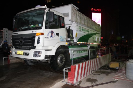 在石家庄地铁1号线解放广场站施工现场,一辆辆印有“石家庄地铁”标志的新型全封闭厢式渣土运输车在夜色中陆续装车驶离,车过之处,路面全无漏洒痕迹,密闭严实的车厢更是从根源上杜绝了扬尘。