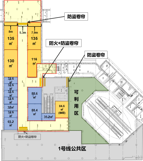 商业开发区位于地下车站一层,总建筑面积约为2491㎡,其中商业公共区(通道+设备))面积约为906㎡,可使用商业面积区1585㎡,作为承租方商铺日常经营管理所使用范围,商业业态形式规划为轻餐饮与零售。