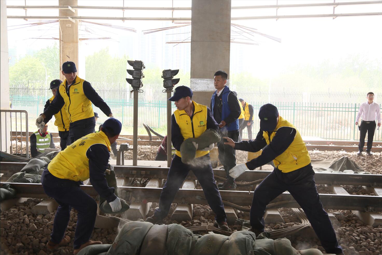 伴随着演练总指挥王龙宣布演练开始,各抢险队迅速就位。本次演练模拟由于突发强降雨,大量雨水在出入段线附近汇集,逐步涌入出入段线。指挥中心收到信息后立即启动《极端天气隧道涌水应急预案》,迅速组织多支应急抢险队伍立即展开应急处置。现场抢险队伍通过使用汽油水泵抽水、沙袋封堵等方式,有效的阻断了现场积水向出入段线涌入,同时出入段线附近积水被水泵排至车辆段外,出入段线积水情况得到有效控制。