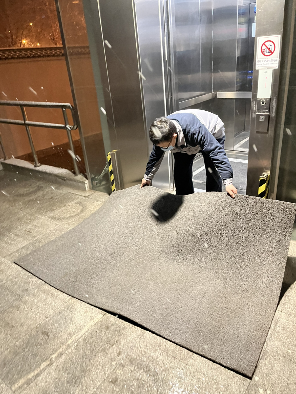 出现降雪天气后,石家庄地铁车站立即在公共区播放提醒广播,在地面湿滑区域的明显位置设置小心地滑牌,车站组织人员在出入口平台、楼扶梯下方铺设防滑垫,地面有积雪或结冰现象时,及时撒放工业盐并用铁锨、竹扫帚进行清理,车站人员及保洁加强巡视,及时打扫出入口积雪。