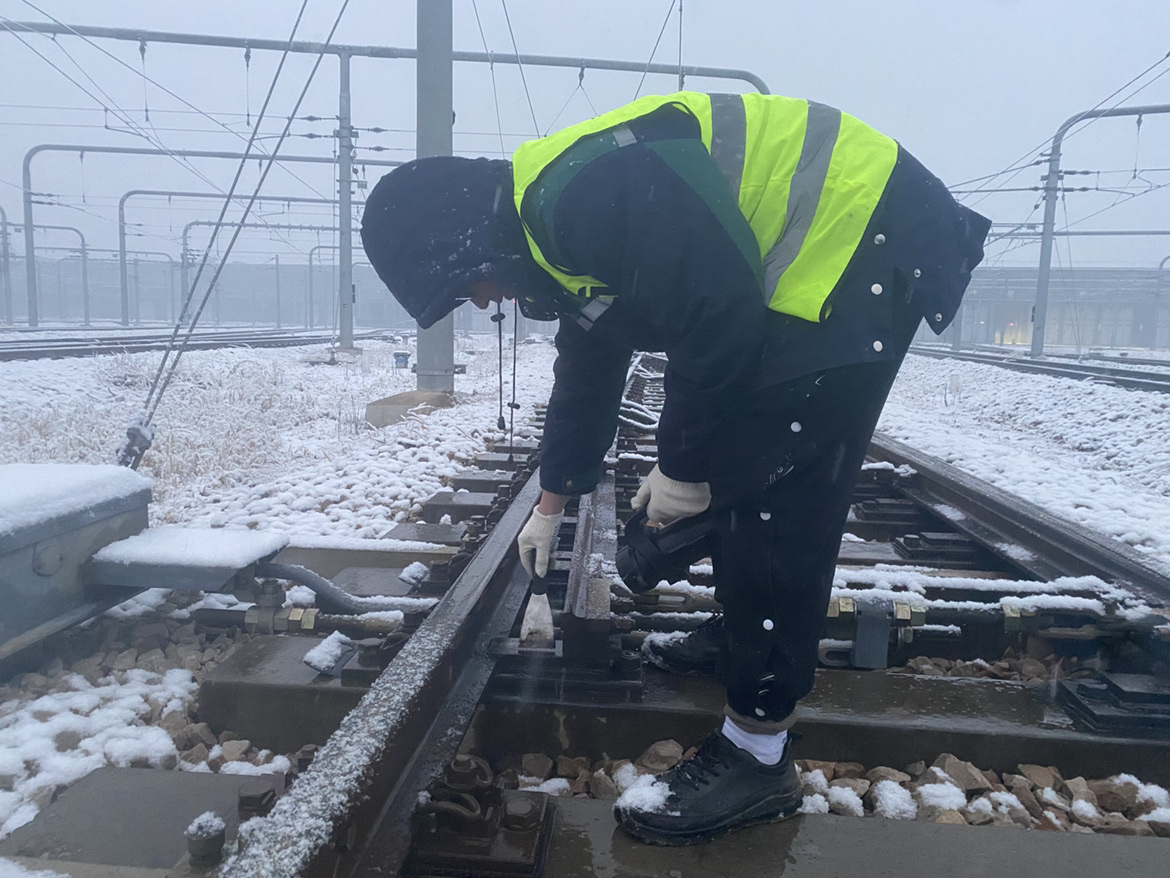 快速响应,迎战雨雪。接降雪预警后,除雪负责人迅速组织值班人员,准备工器具,对接车场调度、信号等专业明确除雪责任区域,降雪后第一时间安排人员赶赴车场信号楼进行驻站防护,积极与车场调度沟通了解收发车进路涉及的股道、道岔,除雪队伍携带相应工器具,对责任区域内的道岔、平过道等重点位置进行细致的除雪、除冰,清除完毕进行测试确认设备无异常后出清轨行区。